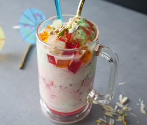In serving glass,add falooda sev,basil seeds,lal sharbat,prepared rabri milk,yellow jelly,red jelly,pistachio ice cream scoop,falooda sev,basil seeds,pineapple chunks,red jelly,yellow jelly,lal sharbat,almonds, pistachios & serve!