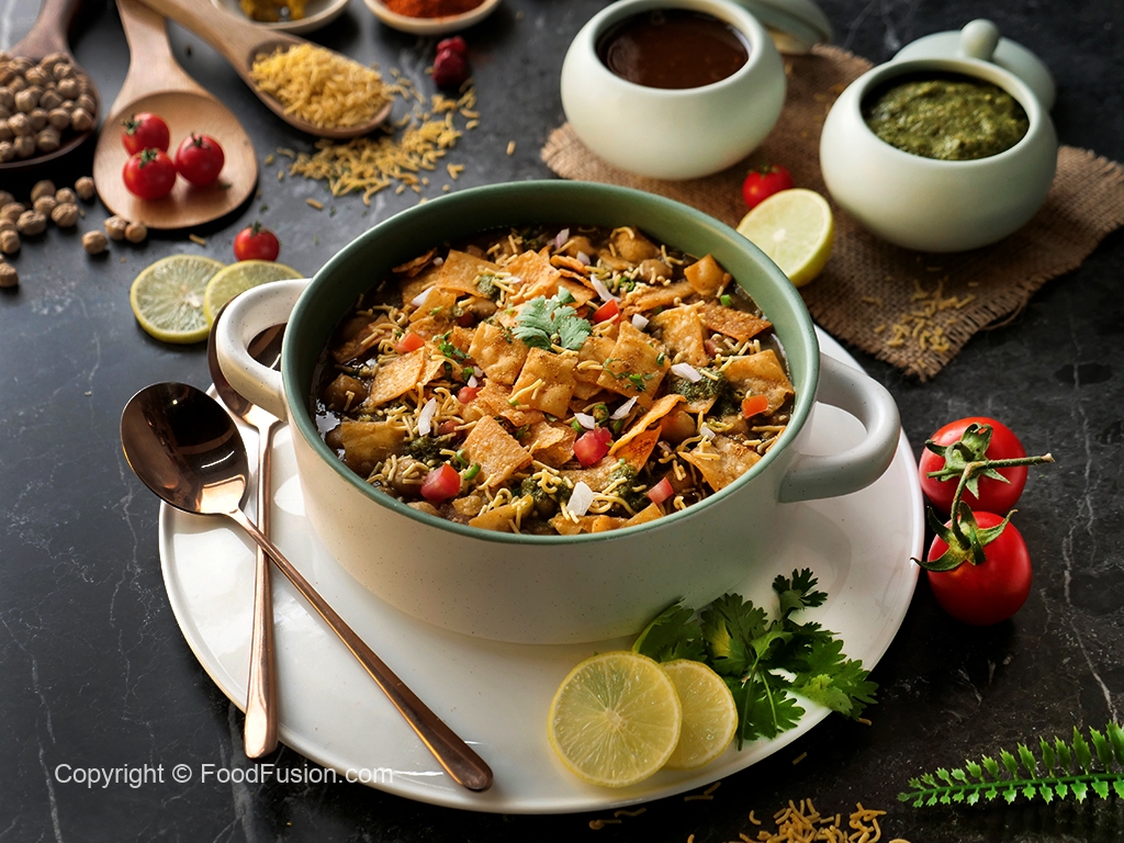 In a serving dish,add ragha chaat,onion,tomato,green chilli,spicy green chutney,tamarind sauce,sev nimco,papri,fresh coriander,chaat masala & serve!