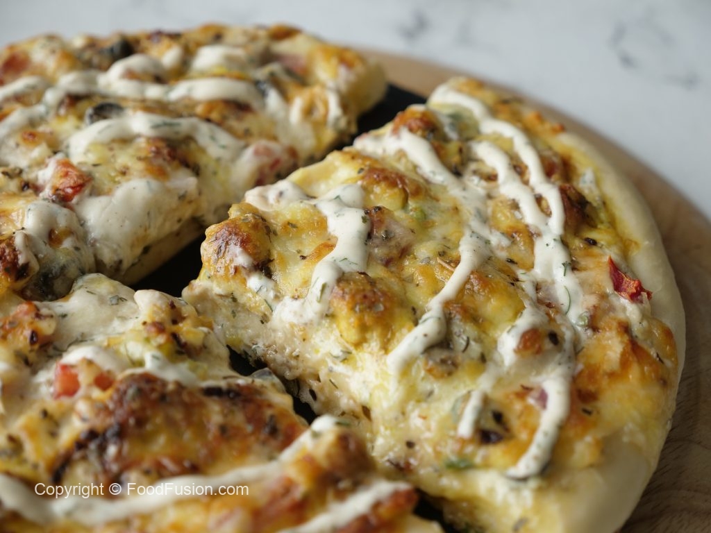 Pizza ko oven sa nikal lein aur ranch sauce ko drizzle ker lein phir slices mein cut lein & serve karein!