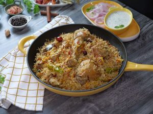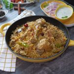 -Green chillies, orange food color, fried onion, lemon slices, fresh coriander, mint leaves dalain, phir kitchen cloth aur lid se cover kar ke dum par 10-12 minutes paka lein.