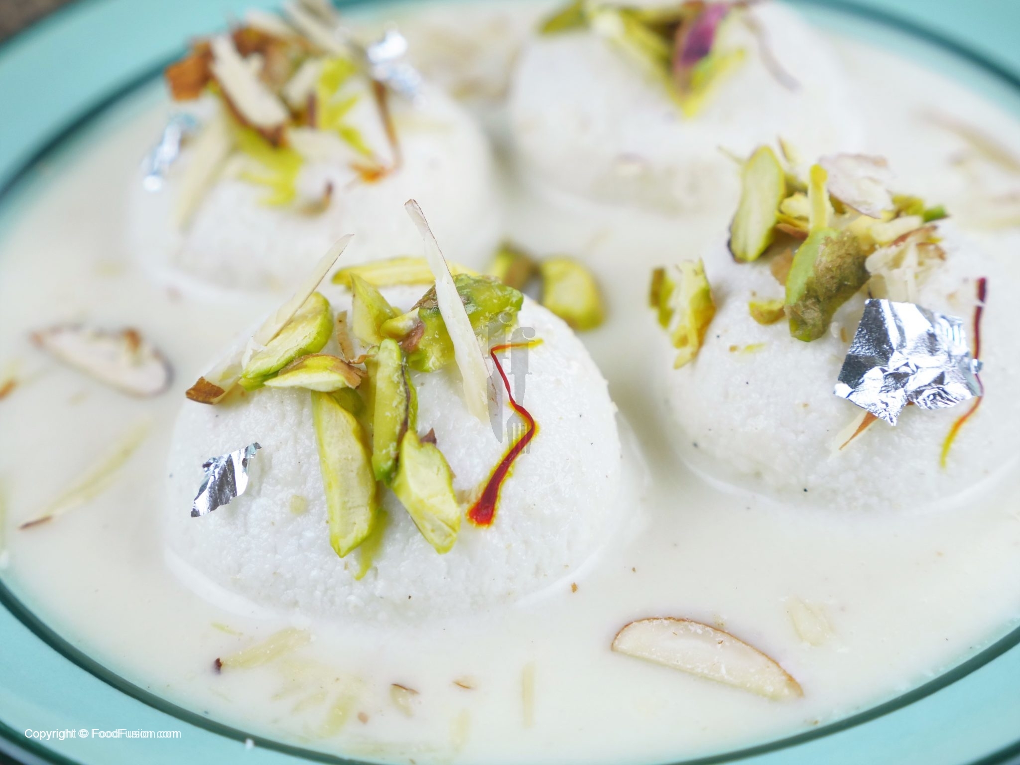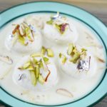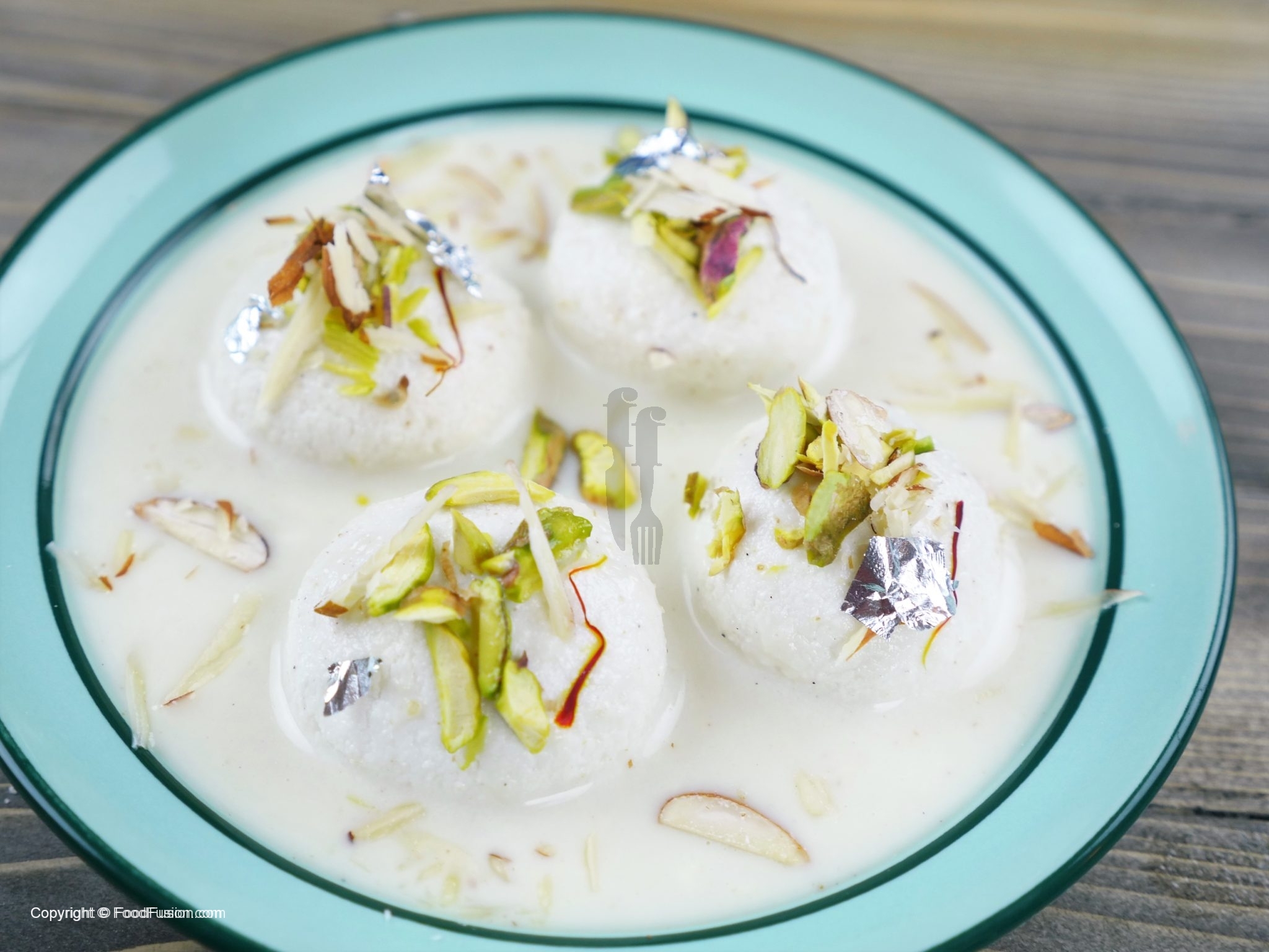 Place cheese balls on serving plate, pour sweet milk (rabri).