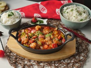 Bowl mein pani,soy sauce,tomato ketchup,hot sauce,kali mirch powder,namak,lal mirch powder,chicken powder aur cornflour dal ker ache tarhan whisk karein & side per rakh dein.