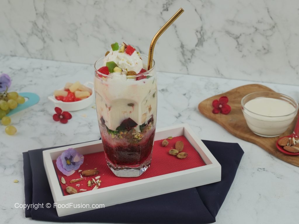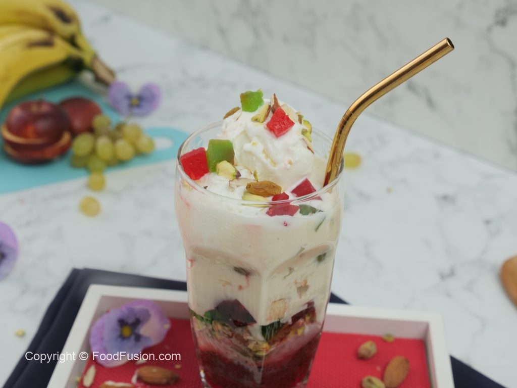 -Serving glass mein soaked tukhme Balanga,lal sharbat,tayyar falooda sawaiyan,mixed nuts,green jelly,red jelly,saib,banana,garpes,pineapple,tayyar rabri, aur vanilla ice-cream dal dein,mixed nuts aur tutti frutti sa garnish ker ka serve karein!