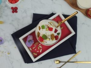 -In a serving glass,add soaked basil seeds,lal sharbat,prepared falooda sawaiyan,mixed nuts,green jelly,red jelly,apple,banana,grapes,pineapple,prepared rabri,vanilla ice-cream,garnish with mixed nuts,,tutti frutti & serve!