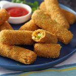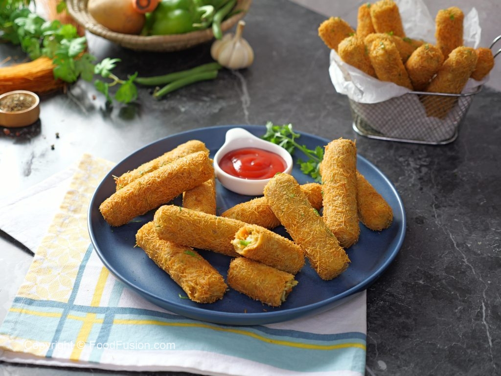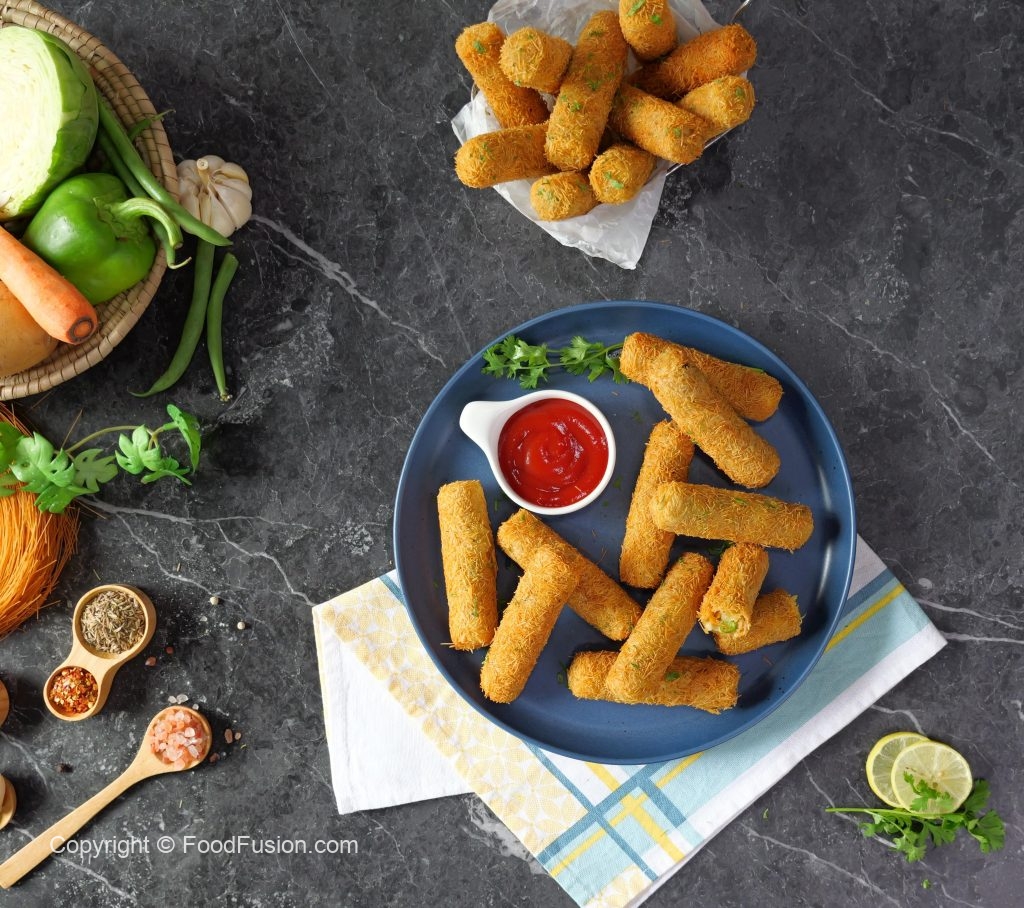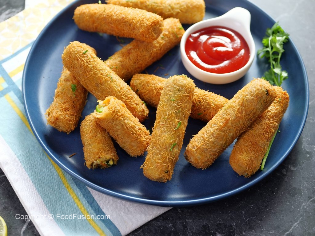 -Grease hands with cooking oil,take 40g of mixture & make finger shape kabab then coat with all-purpose flour,dip in whisked egg & coat with vermicelli (make 24-25).