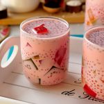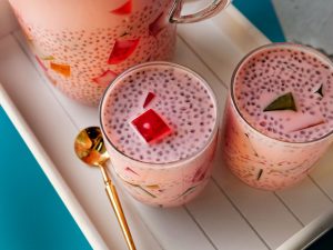 In a jug,add ice cubes,coloured jelly cubes,cooked tapioca sago,soaked basil seeds & prepared milk,mix well & serve!