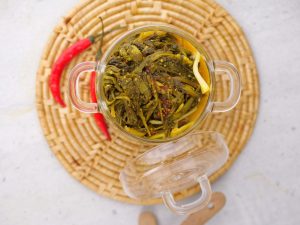 -In a jar, add boiled mustard leaves, green garlic, pink salt, red chilli powder, turmeric powder, mustard seeds, cover & shake until well combined.