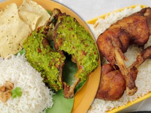 -Bowl mein chicken,pink salt,lal mirch crushed,sabut dhania,zeera,ajwain,lal mich powder,garam masala powder,lemon juice,zarda ka rang,baking soda,baisan,chawal ka atta,til,hara pyaz aur hara dhania dal dein.