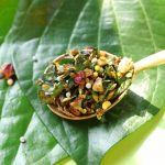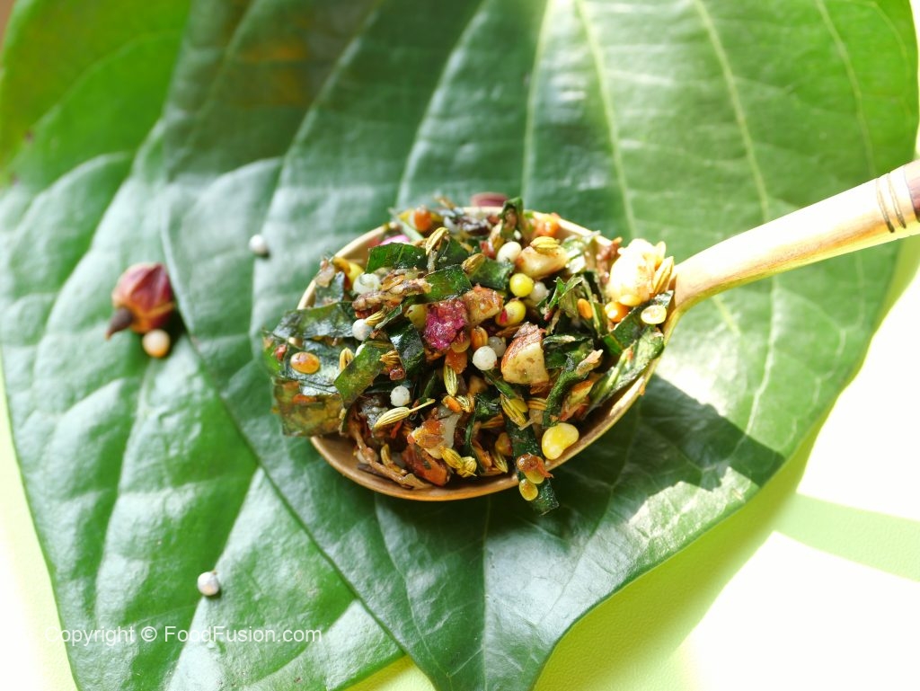 -In a large tray,add betel leaves,roasted fennel seeds,roasted dried coriander seeds,roasted almonds, roasted cashew nuts,roasted dried dates,colored desiccated coconut,betel nut,colored fennel seeds, silver mint balls,rose petal jam,cardamom powder & dried rose petals.