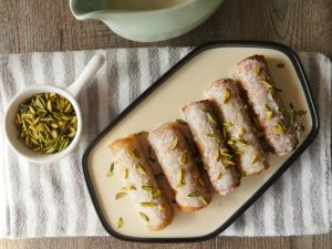 In serving dish,place bread roll ups,pour warm prepared milk.