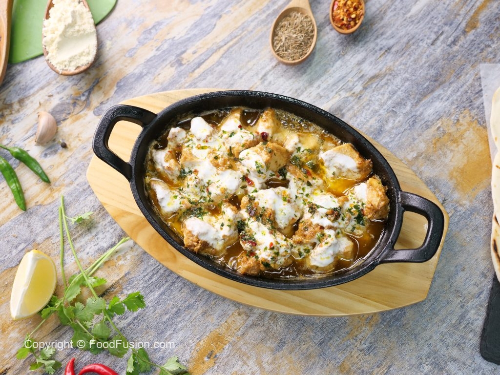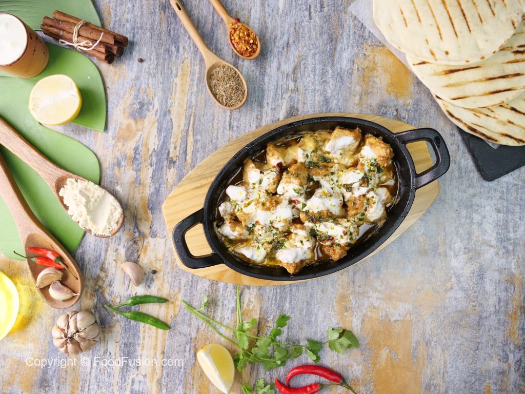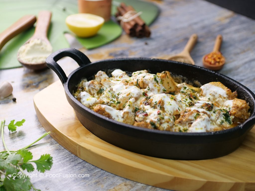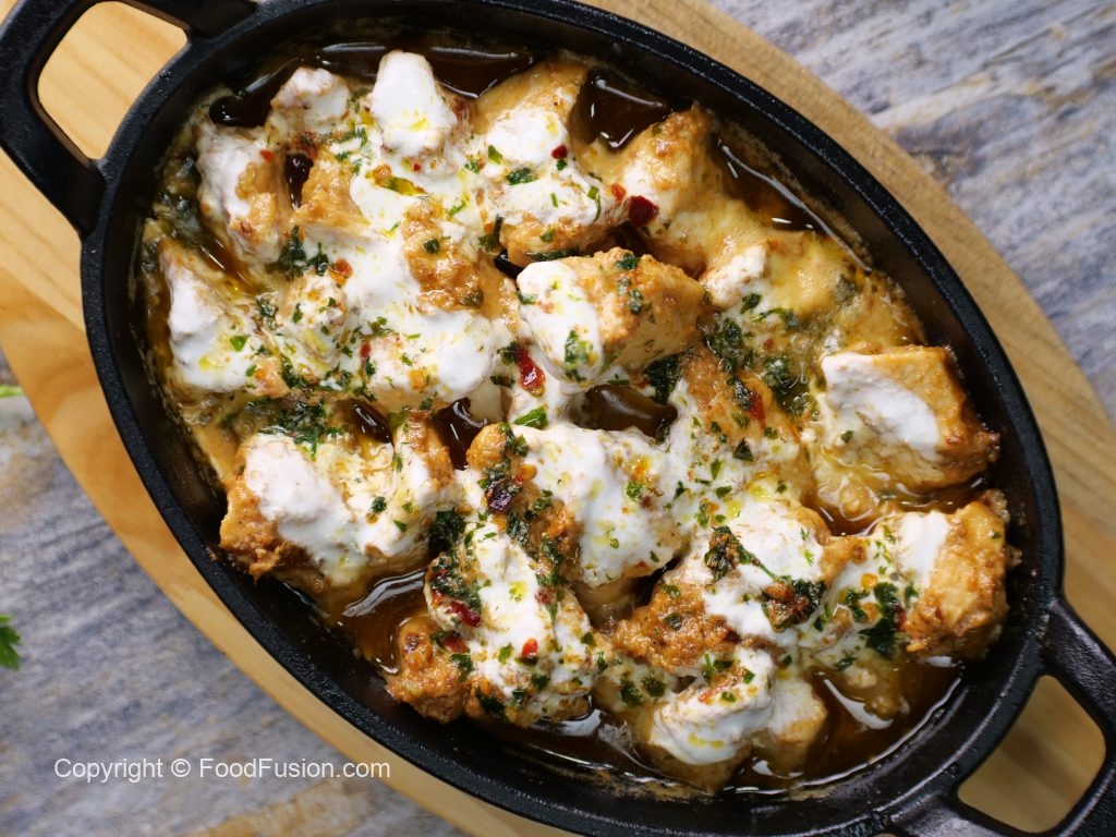 On heated sizzler pan,add chicken boti,pour yogurt,flavored butter & serve!