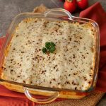 Lasagna sheets,red sauce,smoky chicken,white sauce,lasagna sheets,red sauce,cheddar cheese,mozzarella cheese dal dein,dried oregano aur lal mirch crushed chirak dein.