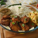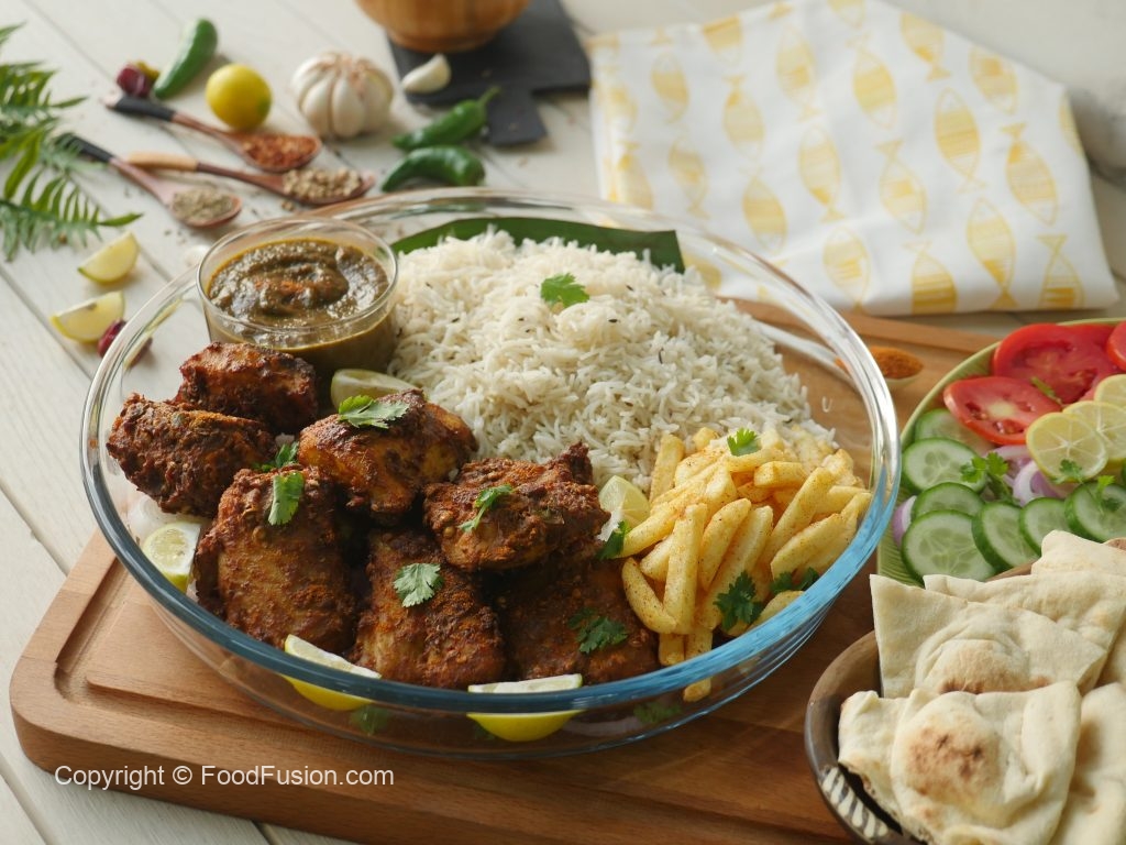 Serve fried fish with zeera rice,potato fries/chips,onion rings and prepared tamarind mint sauce.
