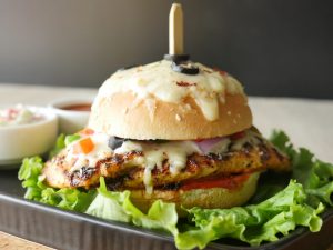 On burger bun,add & spread pizza sauce,place cooked chicken fillet,cheddar cheese,mozzarella cheese, onion,capsicum,tomato,jalapenos,black olives,dried oregano and red chili crushed.