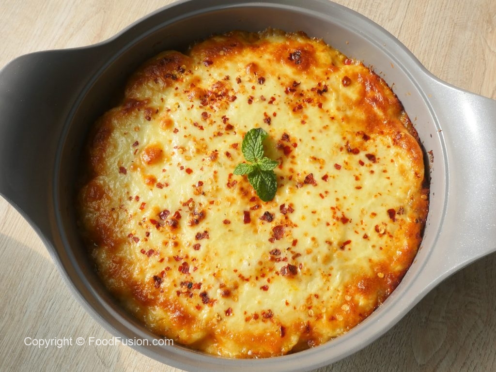 In an oven safe pot,add a layer of sliced & boiled potatoe,cooked chicken mince,mozzarella cheese and fresh coriander,repeat the layer one more time and top with boiled potatoes and pour the egg & cream mixture and mozzarella cheese.