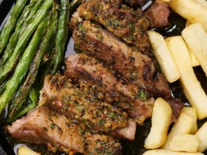 -On a steak piece,sprinkle pink salt,black pepper crushed on both sides & rub gently.