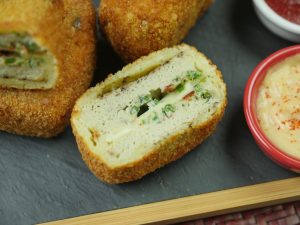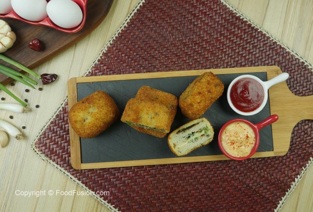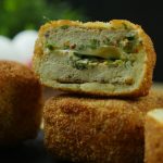 Now dip into beaten eggs and coat with breadcrumbs then again dip into beaten eggs and coat with breadcrumbs (makes 6).