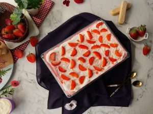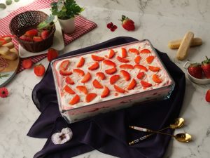 In a serving dish,add & spread strawberry cream,layer ladyfinger biscuits on top then cover with a layer of olper’s whipped cream (reserved) & spread evenly.