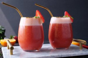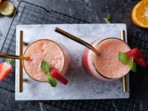 In a blender jug add fresh strawberries, honey, fresh orange juice, crushed ice & blend well.