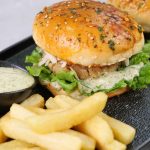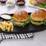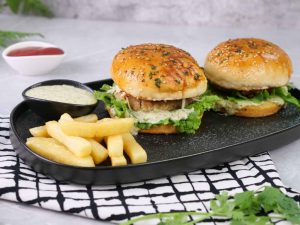 -On burger bun,add & spread prepared burger sauce,salad leaf,fried patty with cheese,tomato ketchup & cover with top bun to make a burger.