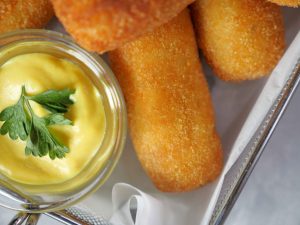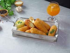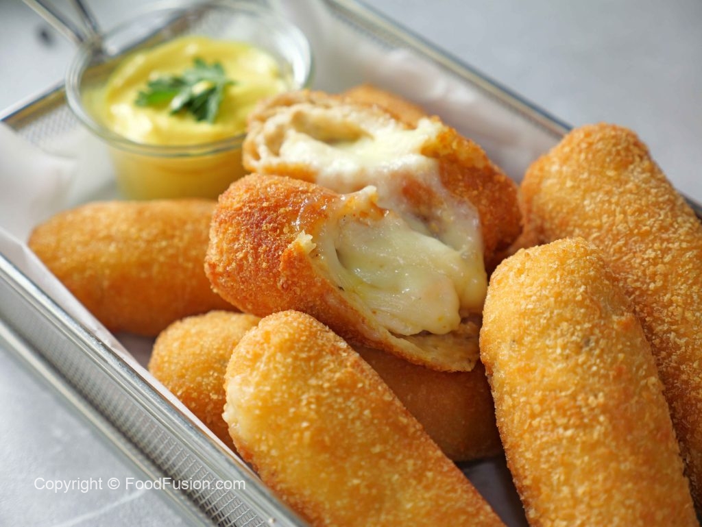 -Coat with all-purpose flour then dip into whisked eggs & coat with breadcrumbs then repeat same coating (makes 8-10 fingers).