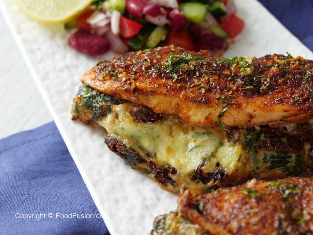 -Now add prepared cheesy creamed spinach on one side,mozzarella cheese,sun-dried tomatoes,fresh parsley & cover with other side of chicken fillet.