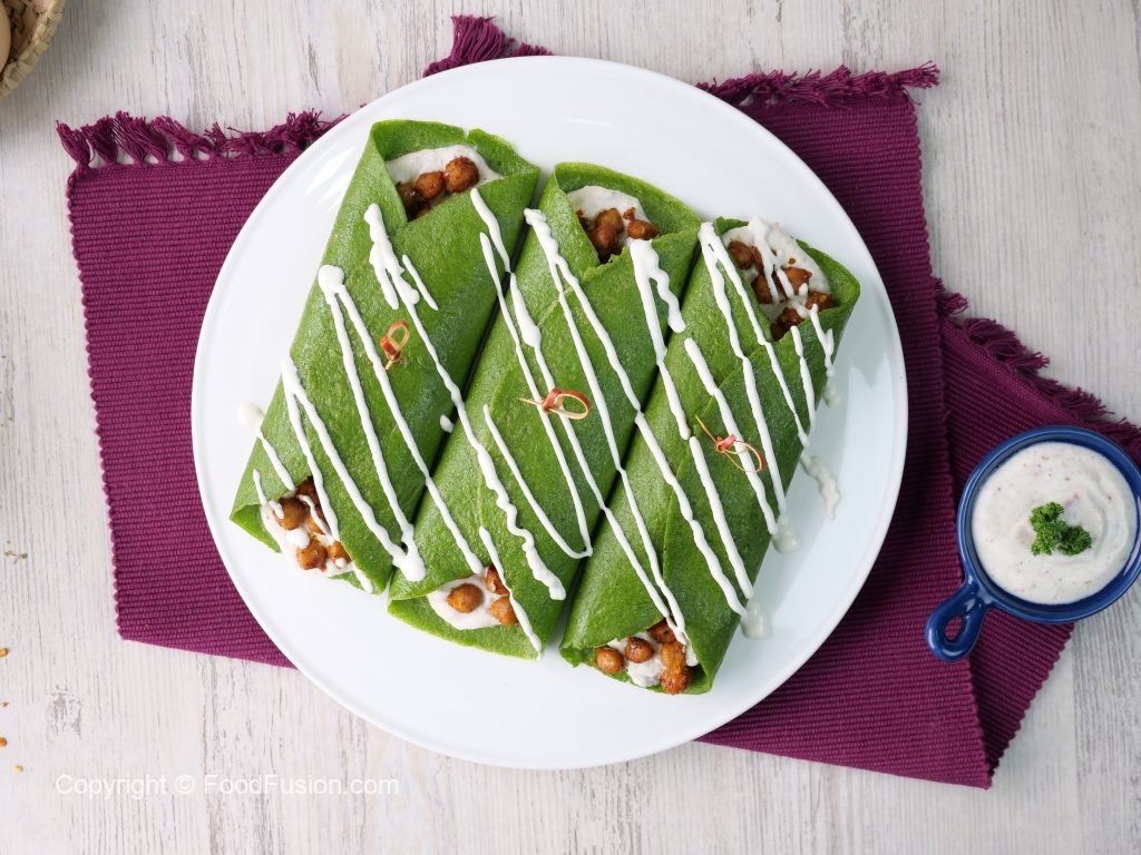 -On a crepe,add & spread prepared yogurt sauce,prepared spiced (masala) chickpea & fold the crepe.