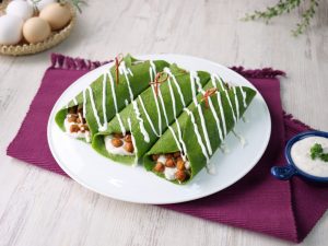-Crepe per tayyar dahi sauce & tayyar spiced (masala) chickpea dal ker crepe ko fold ker lein.