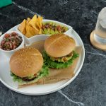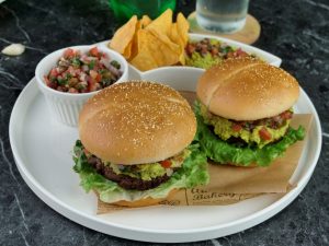 On burger bun,add & spread sour cream,lettuce leaves,beef patty,guacamole,salsa and top with burger bun.