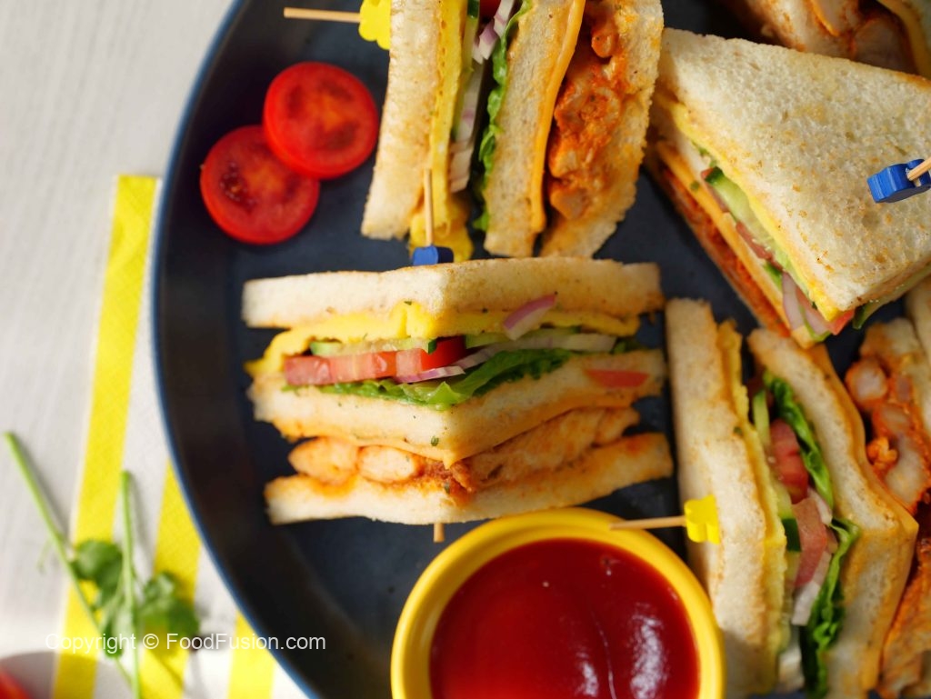 -On three bread slices,add prepared sauce,tandoori chicken pieces,cheese slice,flip one bread slice,add prepared sauce,salad leaves,onion,tomato,cucumber,cooked egg & flip bread slice to make a sandwich (makes 5).