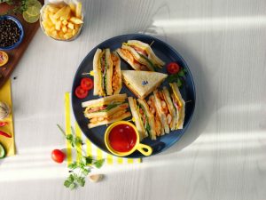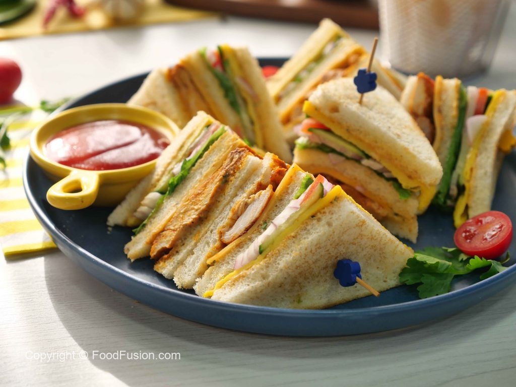 -Three bread slices per tayyar sauce,tandoori chicken pieces aur cheese slice dal ker flip ker lein phir tayyar sauce,salad patta,pyaz,tamatar,kheera aur cooked anda dal dein aur bread slice ko flip ker ka sandwich bana lein.