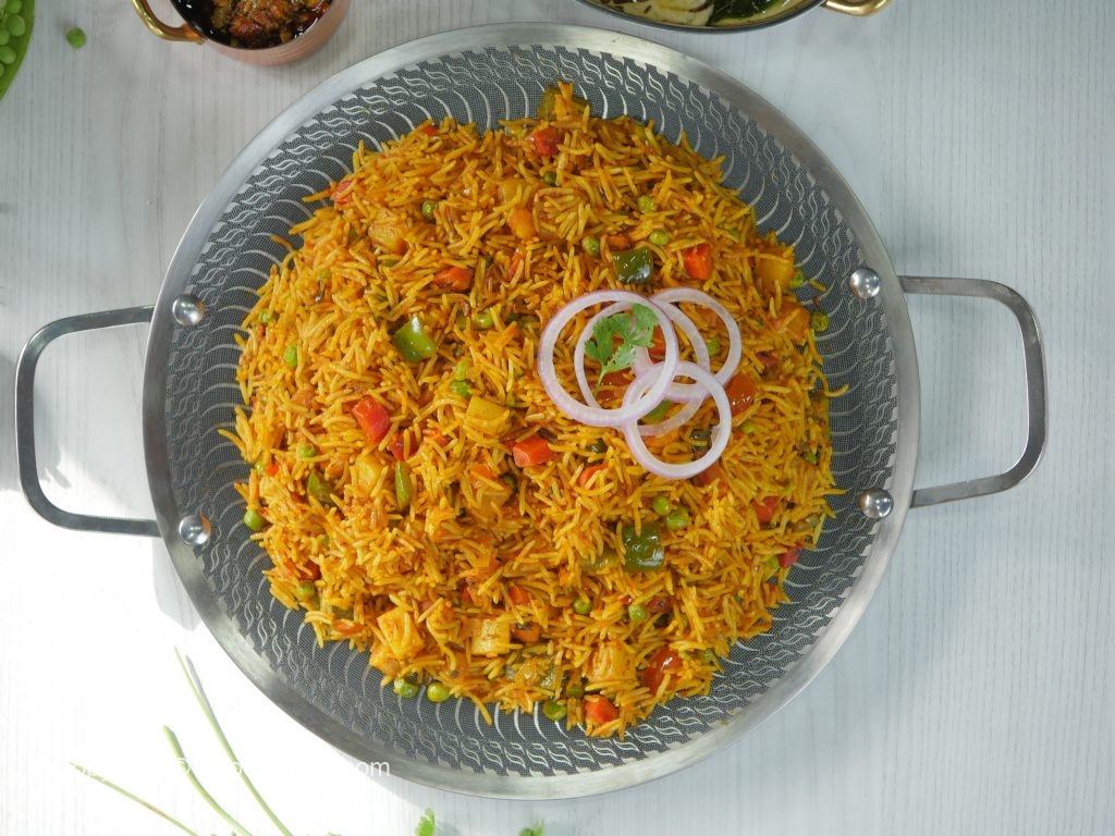 -Garnish tawa veg pulao with onion rings & serve with zucchini dahi.