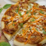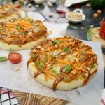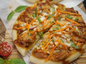 -Add & spread prepared thai peanut sauce,add mozzarella cheese,cheddar cheese,prepared cooked chicken,capsicum,onion,carrots & mozzarella cheese (makes 6).
