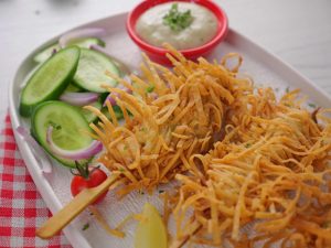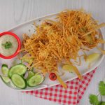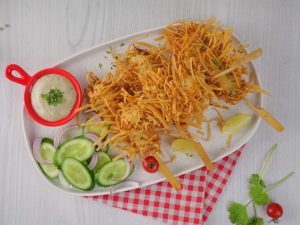 -Coat chicken sticks with roll sheets threads then press to flatten strips properly & set gently and let them rest for 10-15 minutes (makes 11-12).