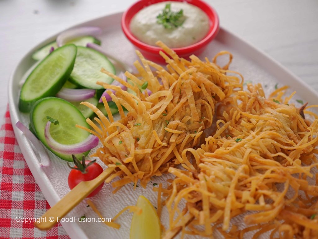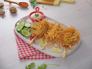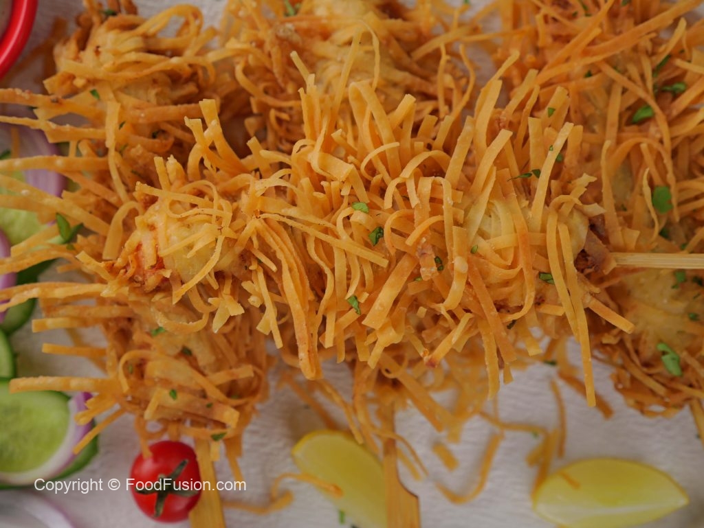 -In a wok, heat cooking oil (140 C) & deep fry skewers on low flame until golden & crispy (10-12 minutes).