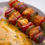 -Thread onion,capsicum,tomato & marinated chicken in a wooden skewer repeat steps 2 times more. (Makes 10-12) & reserve remaining marinade for later use.