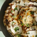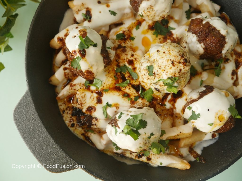 On serving dish,add potato fries,cooked meat balls,garlic yogurt,pour heated meatballs oil,fresh coriander & serve!