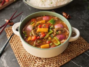 -Chopper mein piyaz, spring onion, gajar, shimla mirch, lehsan, adrak aur hari mirchein dalein aur moti moti chop kar lein.