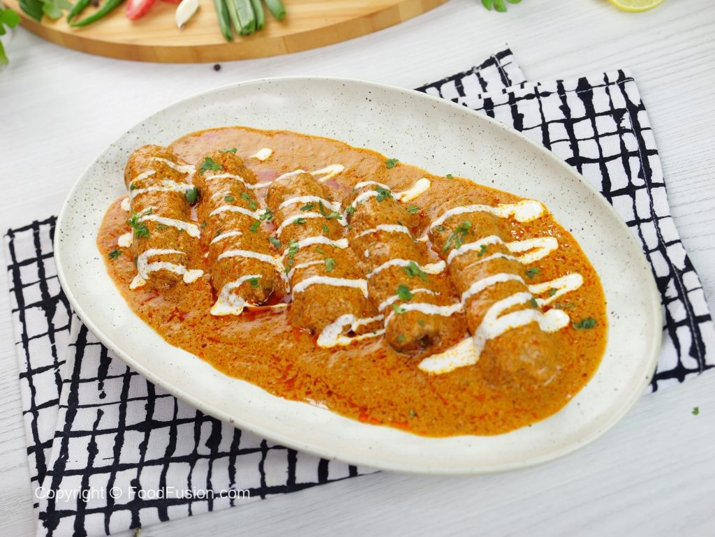 -Serving platter mein vegetable seekh kabab rakhain, upar se gravy dalein, cream aur hara dhania se garnish karen aur naan ke sath serve karen!