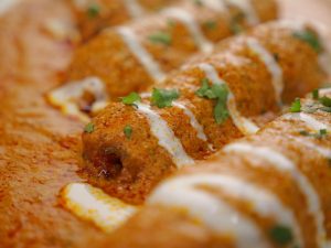 -In a serving platter add vegetable seekh kabab, pour gravy over kabab, garnish with cream & fresh coriander, serve with naan!