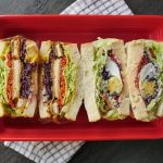 On cling film,place bread slices and apply mayo mustard spread,ice berg,cheese slice,carrots mixture, fried chicken pieces,Bbq sauce,cucumber slices,purple cabbage mixture,tomato slices,fried egg and top with another slice,wrap in cling film then cut into two pieces & serve!