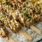 Now thread chicken cubes into wooden skewers (makes 8-10).