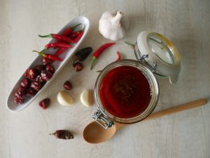 In spice mixer,add cashew nuts,almonds,green chillies,water and grind well & set aside.