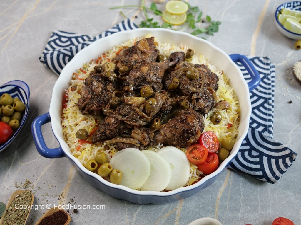 -Marinated chicken aur green olives dal ker dhak dein aur halki ancch per gul janay tak paka lein (30-35 minutes) aur bech bech mein sides ko change ker lein & side per rakh dein.
